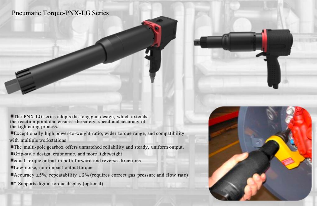 The PNX-LG series adopts the long gun design, which extends the reaction point and ensures the safety, speed and accuracy of the tightening process.